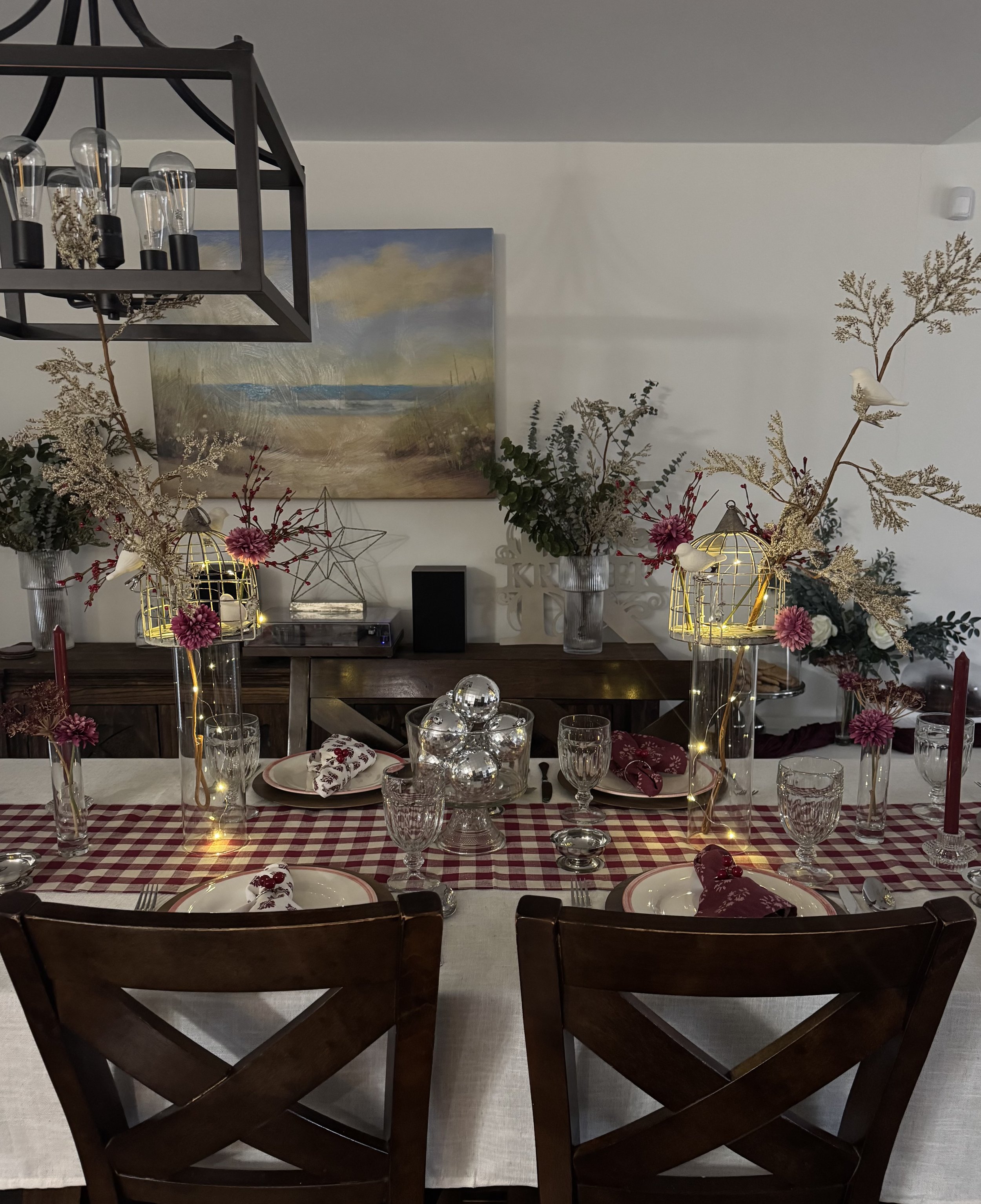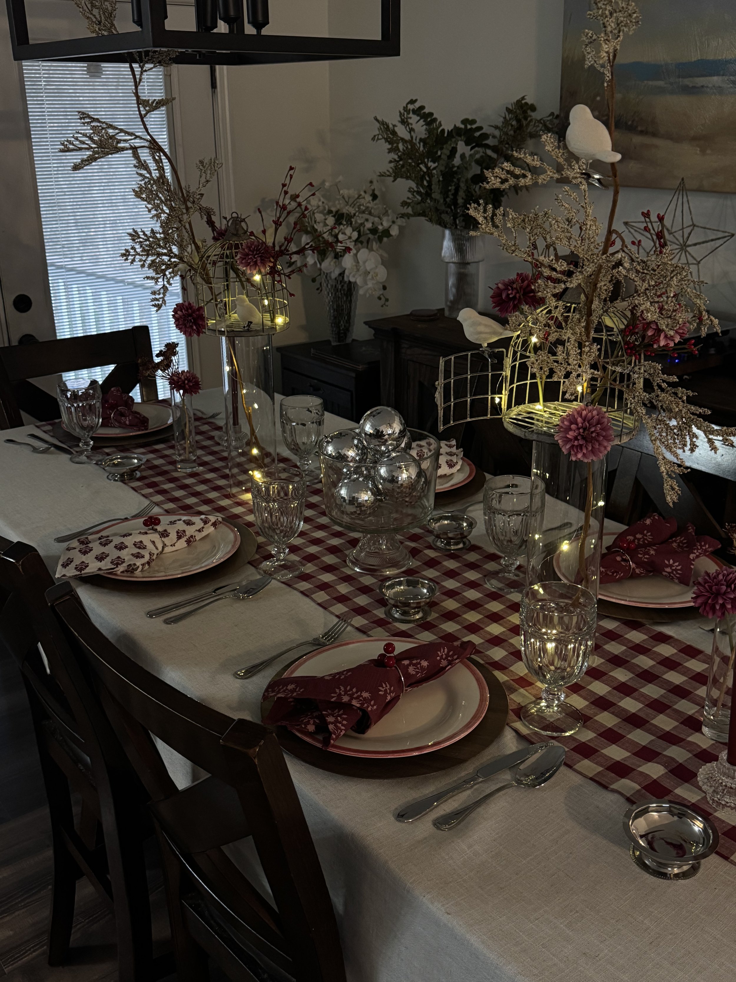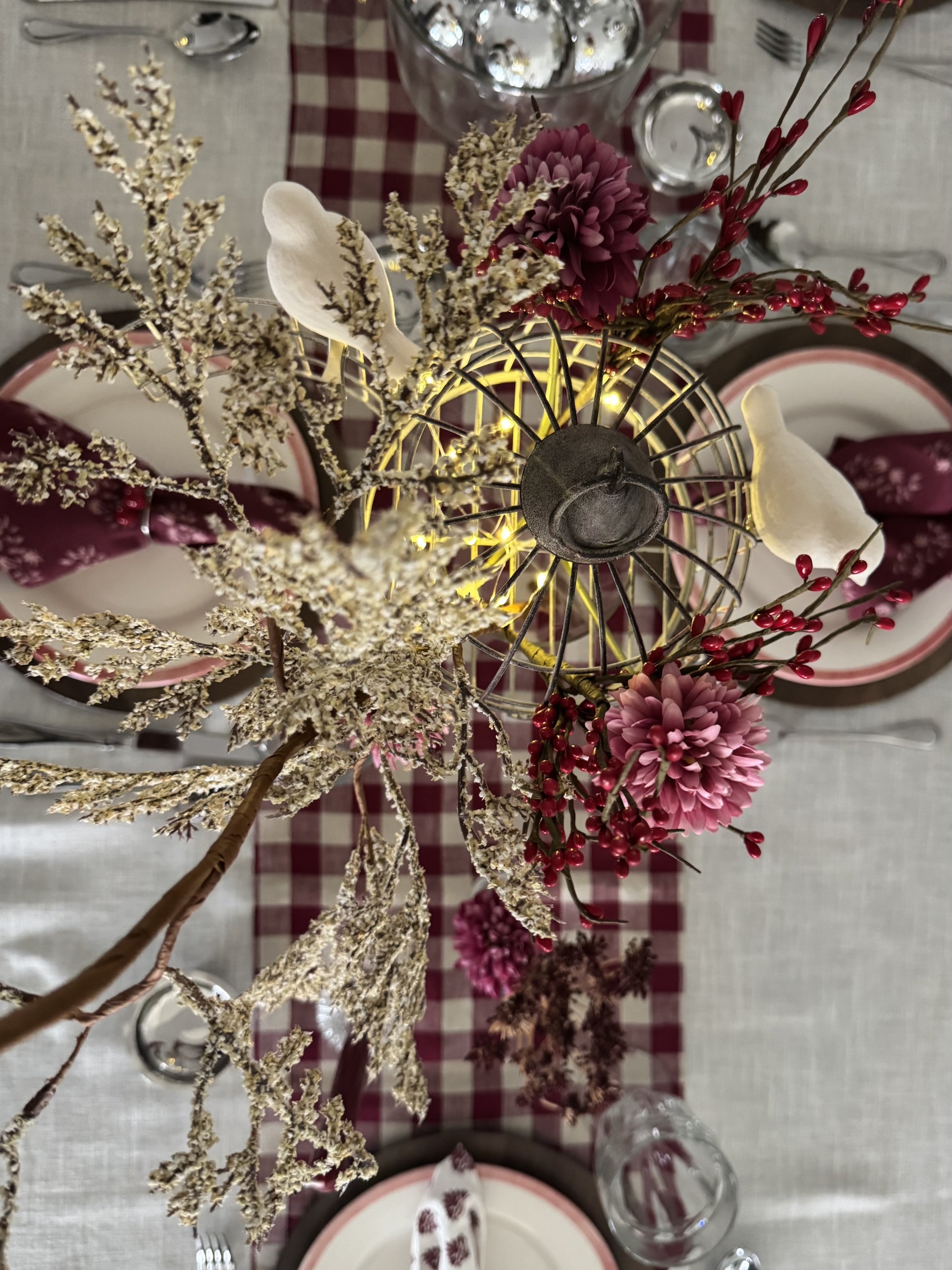This table actually started with the bird cages. I found them at Hobby Lobby and immediately thought about how many ways I could use them beyond Christmas. Spring tables, birthdays, Valentine’s Day, even an intimate dinner party. That’s usually how I shop for table décor. I look for pieces that spark ideas and can be reused to tell different stories throughout the year.