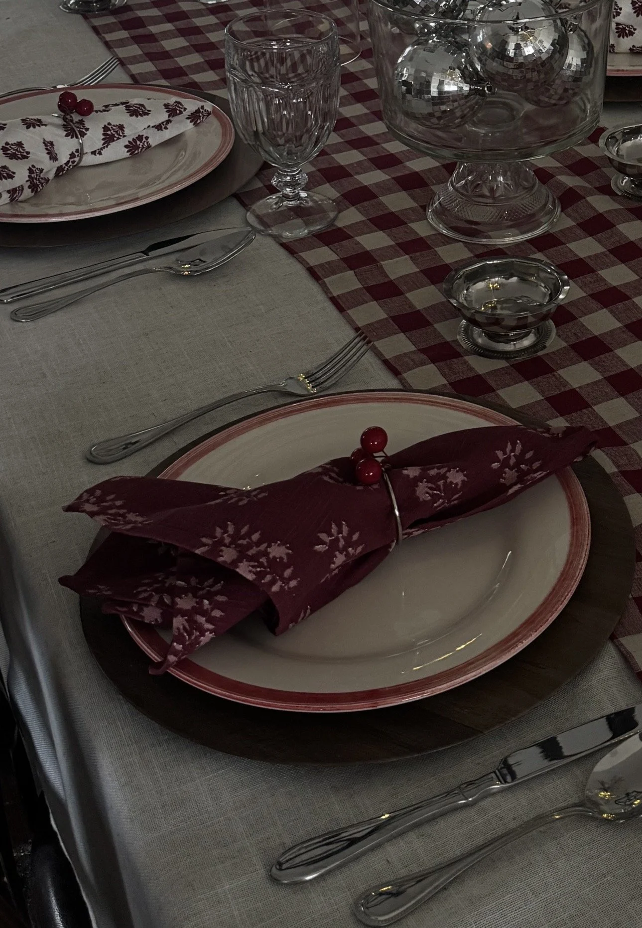 Walnut charger plates grounded the table and added warmth, while the Solino Home checkered table runner and Laura Ashley Dothan tablecloth layered in texture and pattern without competing. Vintage Libbey Gibraltar glasses added a collected, timeless feel, and of course, I couldn’t resist adding a few disco balls for a little sparkle. I love mixing old, cozy, and unexpected details together.